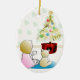 Una niña, su hurón del mascota y el gatito del peluche se sientan delante del árbol de navidad para esperar la visita de Santa. Arte de Deborah Miller