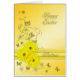 Una magnífica tarjeta de Pascua con flores de margarita amarilla sobre un vibrante fondo giratorio.