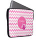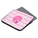 Elegante funda portátil de 15" hecho con un diseño de chevron de zigzag rosa y blanco. Gráficos de un disco redondo rosa y blanco, en el centro del funda, tiene un lindo ladybug rosa y texto de guión blanco personalizado. Personalice el texto por usted mismo o como una idea de regalo tierno para cualquier chica de edad.