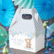 Elegante lindo oso de peluche azul sujetando una caja de favores de bebé con globo azul con nota de agradecimiento.