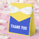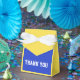 caja de agradecimiento con arco en azul y amarillo