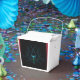 Una taquilla china con un diseño de arte abstracto con los colores azul, verde, rojo y negro. Arte de Angela Rohrig