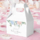 Romántica caja de favores de boda floral con colores polvorientos azules y rosados.