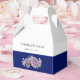 Encanta a tus invitados con esta bonita caja de favores matrimoniales decorada en azul y blanco con flores tanto en la parte delantera como en la parte trasera. También tiene la opción de personalizar fácilmente el mensaje en la parte delantera y trasera de este cuadro de favor.