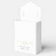 Sencilla, elegante, minimalista, moderna caja de favores matrimoniales blanca y azul marino con nombres de novios y novios, dátiles y corazón de cuerda dorada.