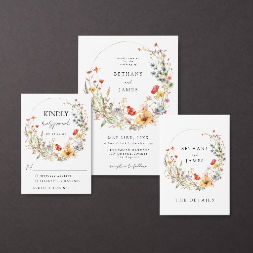 Este elegante diseño cuenta con una delicada corona de flores silvestres de acuarela rústica. Perfecto para los caprichosos bodas de primavera y verano.