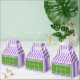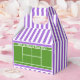 Regalos de caja de favoritas temáticos sobre tenis con pista de tenis y rayas moradas. Edite texto para que el personalizar sea fácil para la fiesta de cumpleaños del tenis, la noche mayor o el evento deportivo.