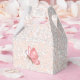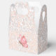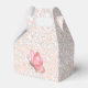 Caja para regalos. Tienda con caja de favores de cinta. Mariposa rosa en flores rosas. Detrás de la mariposa hay un discreto globo rosa. Bebés, cumpleaños, etc.