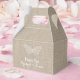 Un hermoso guión de cinta y una delicada mariposa de encaje decoran esta bonita caja de favores.
