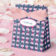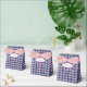 Esta adorable caja de favores tiene un fondo de apariencia denim con un patrón de corazones teñidos de corbata rosa y blanca. En la plancha delantera hay un óvalo blanco con un borde rosado coordinado. Para terminar el diseño hay una proa rosa. Los arcos tienen cuatro colores. El texto dentro del óvalo se puede personalizar.