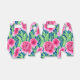 Pintura acuarela floral de flores rosadas y hojas verdes sobre un fondo azul. Un diseño fresco y un añadido a tu colección floral.
