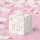 Esta rústica caja de favores matrimoniales de madera cuenta con un bonito corazón y flecha con las iniciales de la pareja y una tenue textura de madera en el fondo.