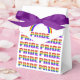 Aquí hay una caja de favores de estilo tienda con la palabra "ORGULLO" en colores arcoiris, formando dos columnas. El flap superior tiene la palabra "ORGULLO" con un arco iris.