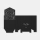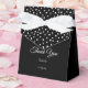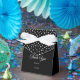 Perlas chic y caligrafía blanca en caja de favores negra.