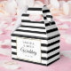 Con un fondo de franjas clásico en blanco y negro, esta elegante caja de regalo de boda presenta un borde de lámina dorada falsa elegante que enmarca los detalles de su boda en tipografía chic y un mensaje especial de agradecimiento en el reverso. Diseñado por Thisisnotme©
