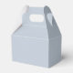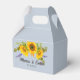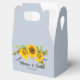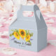 Bonita caja de regalo de boda con un ramo de girasoles pintados al aire libre sobre fondo azul pálido y bloques de texto personalizables con fuentes modernas