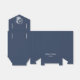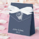 Un fondo azul marino con un hermoso marco vintage con el texto Sr. y Sra. hace una encantadora caja de regalo de boda con un lazo blanco, lista para personalizar en blanco con sus nombres y fecha.