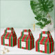 Navidades coloridos caja de favores con forma de gable hecha en un patrón rayado de color rojo, verde y dorado purpurina. Los gráficos de un área de texto blanco decorativa con bordes dorados, en el frente, tienen texto personalizado rojo listo para personalizar. Excelente para tus favores festivos y envoltura para pequeños regalos de Navidades.