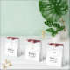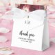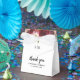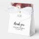 Elegantes cajas de favores matrimoniales con flores rústicas de color burdeos y rosa rubí, tus iniciales, el dicho "gracias", tus nombres y la fecha boda.