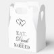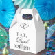Come bebida y sé casada cite la caja de favores de la boda. La fiesta de bodas de Cute DIY favorece la idea de regalo para los huéspedes. Cajas en forma de cuchara para trinquetas o dulces caseros. Diseño de plantilla de moda con tipografía de escritura elegante más dos corazones entrelazados dobles. Mensaje de agradecimiento personalizado con nombres o monogramas de novia y novio más fecha de matrimonio. Elegante material fiesta y elegantes accesorios para agradecer la llegada. Diversión para bodas alegres. También es agradable regalar regalo para ducha de novia, damas de honor, barbacoa de parejas de patio trasero, compromiso o aniversario. Cambiar la cantidad para obtener el precio al por mayor. Parte de diseño en blanco y negro del conjunto de colección elegante. Fondo de color de personalizable.