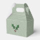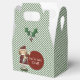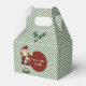 Navidades rayados verdes y blancos con forma de caja de regalo pequeña, con gráficos coloridos de un elfo de niña pequeña y brotes de holly. Un área de texto circular roja, en la parte delantera del cuadro, tiene el texto blanco personalizado listo para personalizar. Estupenda caja de vacaciones para favores de fiesta, pequeños regalos, y como se muestra, como una divertida caja que te han mandado.