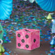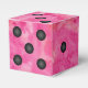 El fondo de color de agua rosa representa esta caja de regalo de la fiesta de diseño de dados de maravilla. Perfecto para eventos temáticos de Bunco, Casino o Vegas.