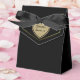 Moda Sweet 16 caja de regalo de evento hecho en negro con acentos dorados, en la solapa delantera. Los gráficos de un corazón con aspecto de purpurina dorado tienen texto personalizado negro listo para personalizar. Pequeña y encantadora caja de regalo para caramelos y cualquier otra cosa que quieras regalar a tus invitados.