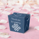 Dé a tus invitados, damas de honor, padrinos, o a cualquier otra persona un regalo especial con estas cajas de personalizable de fondo azul marino con un nudo blanco chino de buena suerte en la parte delantera y trasera de la caja. Ambos lados también incluyen un texto de ejemplo que puede personalizar para su propio boda o evento. No olvide visitar los otros productos de la elegancia china en la marina para crear una imagen verdaderamente coordinada para su evento.