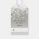 Las etiquetas colgantes de moda para tu tienda o negocio minorista tienen letras negras clásicas en un fondo gris plateado adornado con una ráfaga de luces blancas de bokeh en la parte superior. Personalizar con dos líneas de texto personalizado. Espacio blanco para escribir a tu precio. Ajuste el símbolo de la moneda según sea necesario utilizando la plantilla. Los respaldos son de color blanco sólido para el texto de su personalizado adicional o el mensaje manuscrito.