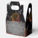 Abramos la elegancia de las flores negras, naranjas y moradas del otoño, mientras disfrutamos la belleza del macabro y el encanto de lo desconocido. Esta encantadora caja de favores matrimoniales es un oscuro patrón floral de rosas antiguos, púrpura y naranjas quemados en negro. El frente tiene los nombres de las parejas y la fecha boda adornada con ornamentadas florituras góticas negras. Esta caja de favores es de un encanto oscuro y un encantador favor de su boda único.