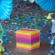 Gracias a sus empleados, o clientes con un regalo especial o una caja de regalo. Ideal para regalos corporativos para clientes o empleados. También se puede usar para favores de boda o celebraciones de cumpleaños llenas de dulces o regalos. Una caja de regalo de perro brillante de rayas rosadas, verde limón y violeta. Diseñado por Sarah Trett.