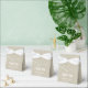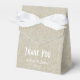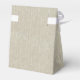 Un fondo de lino natural crema hace una encantadora caja de favores matrimoniales con un arco blanco y las palabras Gracias en blanco, listo para el personalizar con sus propios nombres y fecha.