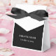 Moderna y elegante caja de Favor de Bodas Botánicas en Blanco y Negro. Esta moderna y elegante caja de favores matrimoniales presenta un fondo negro en el frente y en la parte posterior con un guión moderno de caligrafía, así como una cinta negra. Puede personalizar los nombres de la novia y del novio, la fecha del boda, el color del fondo y del guión, así como el propio tipo de letra. La parte posterior de la caja cuenta con un hermoso ilustracion romántico de novia y novio, negro y blanco, con un fondo botánico minimalista que puede conservar o retirar según lo considere oportuno. También puede cambiar el color de la cinta. Diseñado como parte de la colección Modern Elegant Black and White Botanical Boda.