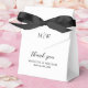Cajas de favores de boda personalizadas con un simple fondo blanco, sus iniciales, el dicho "gracias", sus nombres y la fecha del boda.