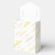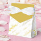 Caja de favores blancos con tonos de celebración en un tipo de letra decorativa con glifo de diferentes tamaños. La "tapa" frontal es de color sólido, por lo que la cinta blanca muestra. Esta caja de favores y diseño es versátil y va para la mayoría de las ocasiones y temas; cumpleaños, Boda, aniversario, feriado y más. El diseño clásico monocromo con dos colores lo hace elegante y moderno. Viene en versiones Gold y Silver.
