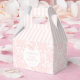 La caja de favores, adorable y sofisticada, cuenta con una moderna cinta de pino rosado de bebé pastel con peonías cortadas en el fondo.