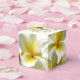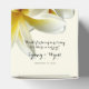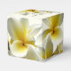 Pequeña caja de favores cúbicos con un gran diseño de flores plumeria. Flores amarillas y blancas cubren esta caja con tres líneas de texto personalizado encima. Agradece a los clientes en una ducha o recepción y se llena de regalos. Puede cambiar el estilo, pero por favor elimine todo el texto de ejemplo ya que puede imprimirse en lugares raros. Los colores son crudos, blanquecinos, blancos y dorados amarillos. El texto es un guión negro elegante con fecha impresa. Estas cajas vendrán planas y tendrán que doblarse.