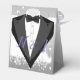 Cajas de favores matrimoniales con temática de vestir y esmoquin. Diseño personalizado personalizado con nombres y fecha.