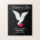 Este rompecabezas de la sierra del personalizable para siempre en amor presenta una hermosa paloma blanca que lleva un corazón, y un texto de la paloma blanca que ha sido puesto contra un fondo negro. Las tres últimas líneas del elemento se pueden personalizar con la información de su boda.