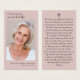 Estas tarjetas de oraciones fotográficas del tamaño de una billetera son fáciles de llevar en una billetera o bolso, lo que las convierte en un gran regalo para los amigos y la familia que asisten a un funeral, servicio conmemorativo o celebración de la vida. Esta tarjeta ha sido diseñada con Salmo veintitrés pero puedes cambiarla a otra oración o poema usando el botón Personalizar. La fotografía tiene fines ilustrativos y puede cambiarse a una de las tuyas.