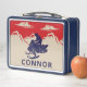 Crea un regalo personalizado para tu moto de nieve favorita. Esta manta de lonchera tiene un ilustracion de estilo vintage de un moto de nieve y un jinete de azul marino frente a un fondo de montañas de color crema o marfil con un fondo rojo. Está listo para ser personalizado con un nombre en letras color azul marino.