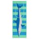 Una bolsa brillante de vino "tiburón" estampada en esos atractivos colores de aguas caribeñas, lista para meter una botella. El ilustracion de tiburón Mako es de dagdart.