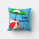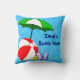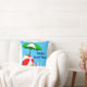 Una almohada personalizada con letras retro en azul y divertido arte temático de playa o piscina con una pelota de playa roja, paraguas solar verde, sandalias de vacaciones y aceite bronceador sobre un fondo de azules claros y olas rizadas. Haga clic en Personalizar para cambiar las fuentes, los colores de fondo y más.