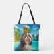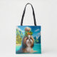 Escápese al paraíso con este tote de lienzos con Magnum el Shih Tzu en un entorno tropical impresionante. Magnum, con sus exuberantes montañas verdes, sus palmeras balanceadas y sus aguas cristalinas como telón de fondo, brilla en su tejado de inspiración isleña adornado con hojas vibrantes y una flor naranja brillante. Perfecto para llevar productos básicos de playa, comestibles o de uso diario, este tote combina la practicidad con un diseño encantador que celebra la belleza de los destinos tropicales y el encanto adorable de Magnum. A tu disposición, te sumergirás en un tote lleno de pavimentos, perfecto para los amantes de los perros y de los sueños tropicales.