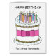 Una simple ilustración de un gran pastel de cumpleaños blanco cubierto de velas encendidas, y con un lazo rosa atado alrededor. Las palabras 'Feliz cumpleaños a un gran paramédico' acompañan la imagen, que tiene un fondo blanco.