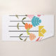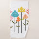 Este conjunto de toallas incluye un paño de naranja claro, una toalla de mano naranja más oscura y una toalla de baño con un diseño moderno de mediados de siglo de flores hechas de cuadrados, óvalos y diamantes que han sido manipulados para formar flores.