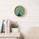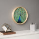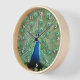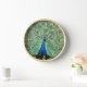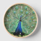El pavo real es todo "ojos" en el tiempo. Con orgullo, el pájaro tiene plumas verdes brillantes acentuadas con los centros azules reales y plumas de cabeza y cuerpo de azul. Los números blancos con sombra de caída están en el borde.