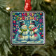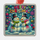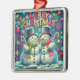 Una pareja de muñecos de nieve con gorras, pañuelos y mitones, rodeados de coloridos corazones y remolinos de Navidad y plata, humo dorado y blanco, manta de color purpurinoso, copos de nieve coloridos, bastones de caramelo y corazones.