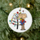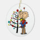 Un adorno de vacaciones de Navidades de conservas de cerámica redonda de bonito incluye una pareja de figuras de palos que obviamente están enamorados.