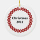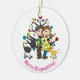 Una pareja expectante de un palo, dos gatos y un perro delante del adornado árbol de vacaciones con un área que dice "¡Estamos esperando!" en rosa. La parte trasera ornamental tiene un anillo cardíaco rojo con texto que se puede personalizar con los Navidades del año en curso!